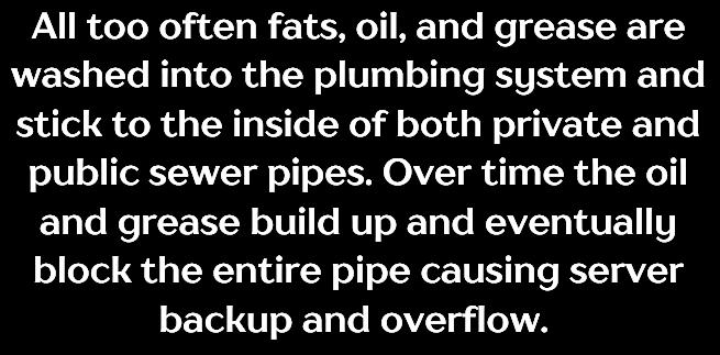 Sewage backups and overflows are typically the results of grease buildup which can cause property damage, environmental problems, and other health hazards Fats, oils, and grease can enter the sewer system from commercial food establishments and private residents.