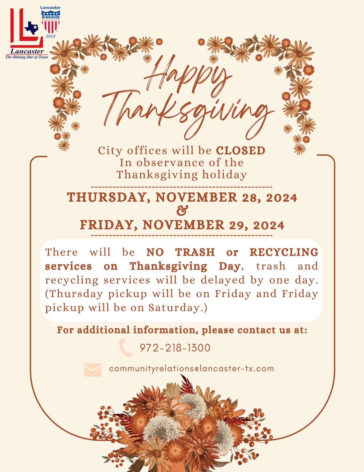 Special assistance is available for those who are physically unable to place trash cart(s) out for collection. Visit Lancaster City Hall or call 972-218-1300 to receive a Special Assistance form.