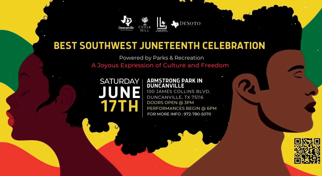 The City of Lancaster Invites you to our Juneteenth Celebration filled with Fitness Classes, Cultural Art Collective, Food Trucks, Musical Performances, and more. This event will be held on Saturday, June 17th at Armstrong Park in Duncanville, TX.