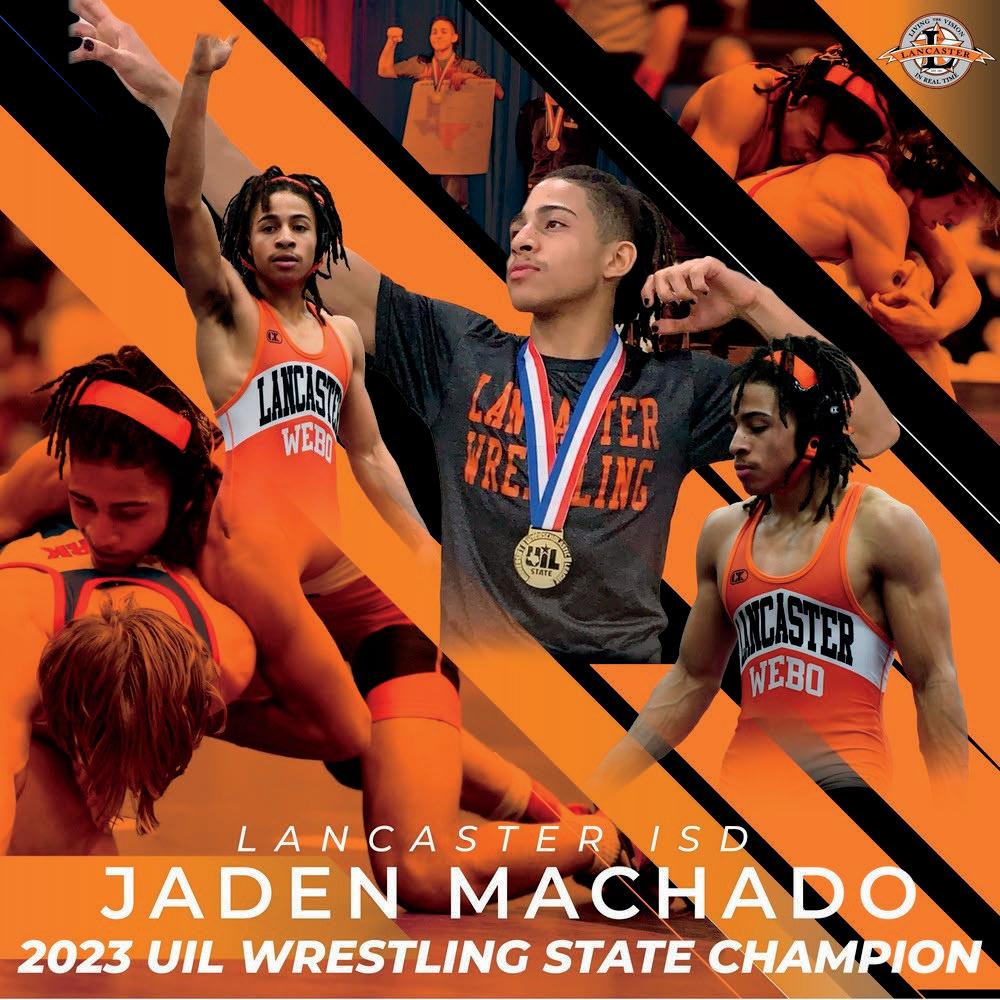 Continuing the academic and athletic excellence trend in Lancaster ISD, Lancaster High School boasts a new athletic achievement. Senior Jaden Machado is the 2023 UIL Wrestling state champion after winning the 138-pound weight class in February. This historic win makes Jaden the first wrestling state champion in Lancaster High School history
