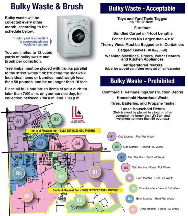 Regular trash and recycle trash are collected ONCE a week. Lancaster is divided into five (5) areas and the day your regular trash is picked up depends on what area you live in. You can view an interactive map that will assist you in determining what day of the week your regular trash is scheduled for collection on our city website.