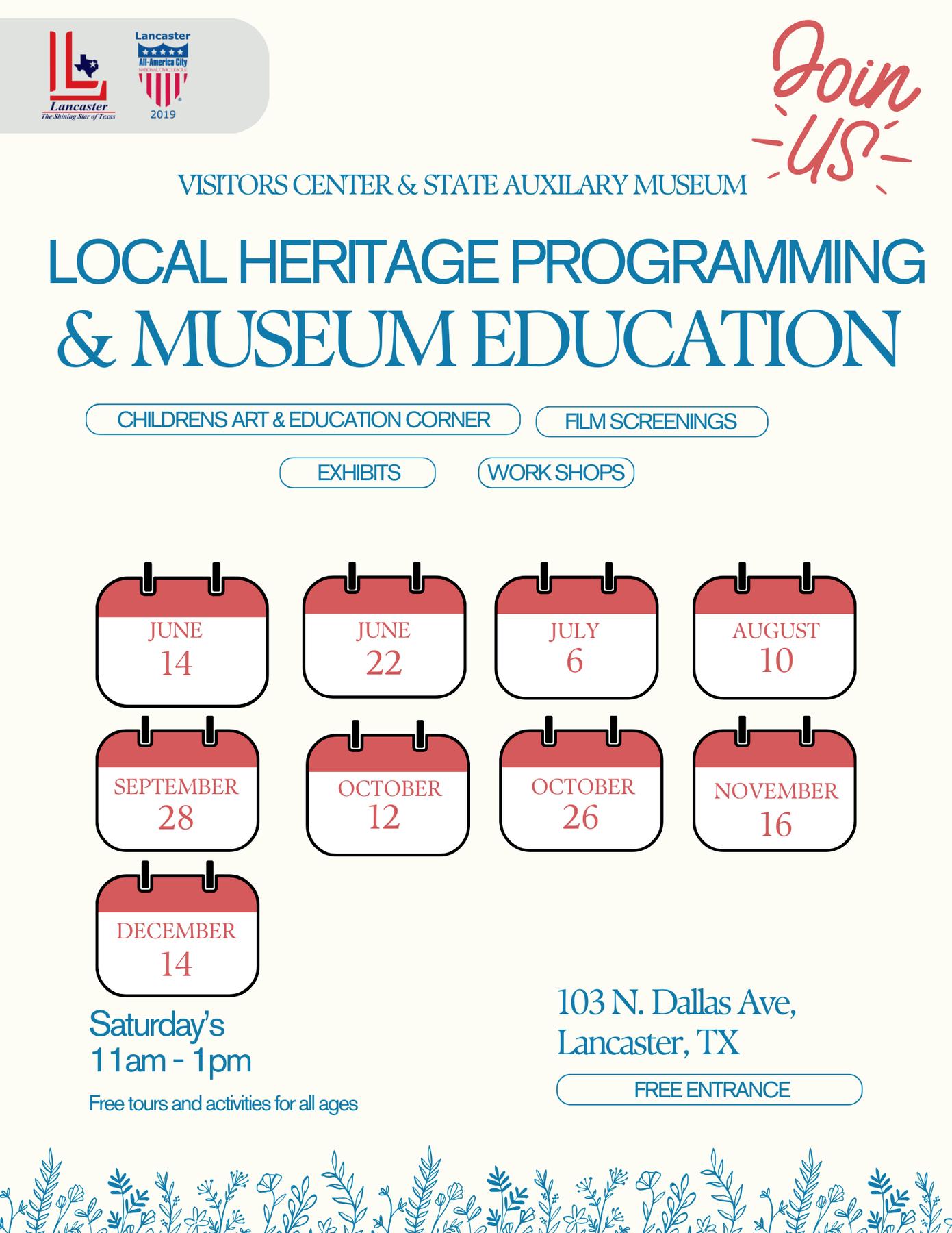 Locatedat103N.DallasAve,Lancaster,Tx 75146.Stepintothepastandexplorethe diverseheritageofLancasterthrough engagingexhibitsthatareboth educationalandentertaining.
