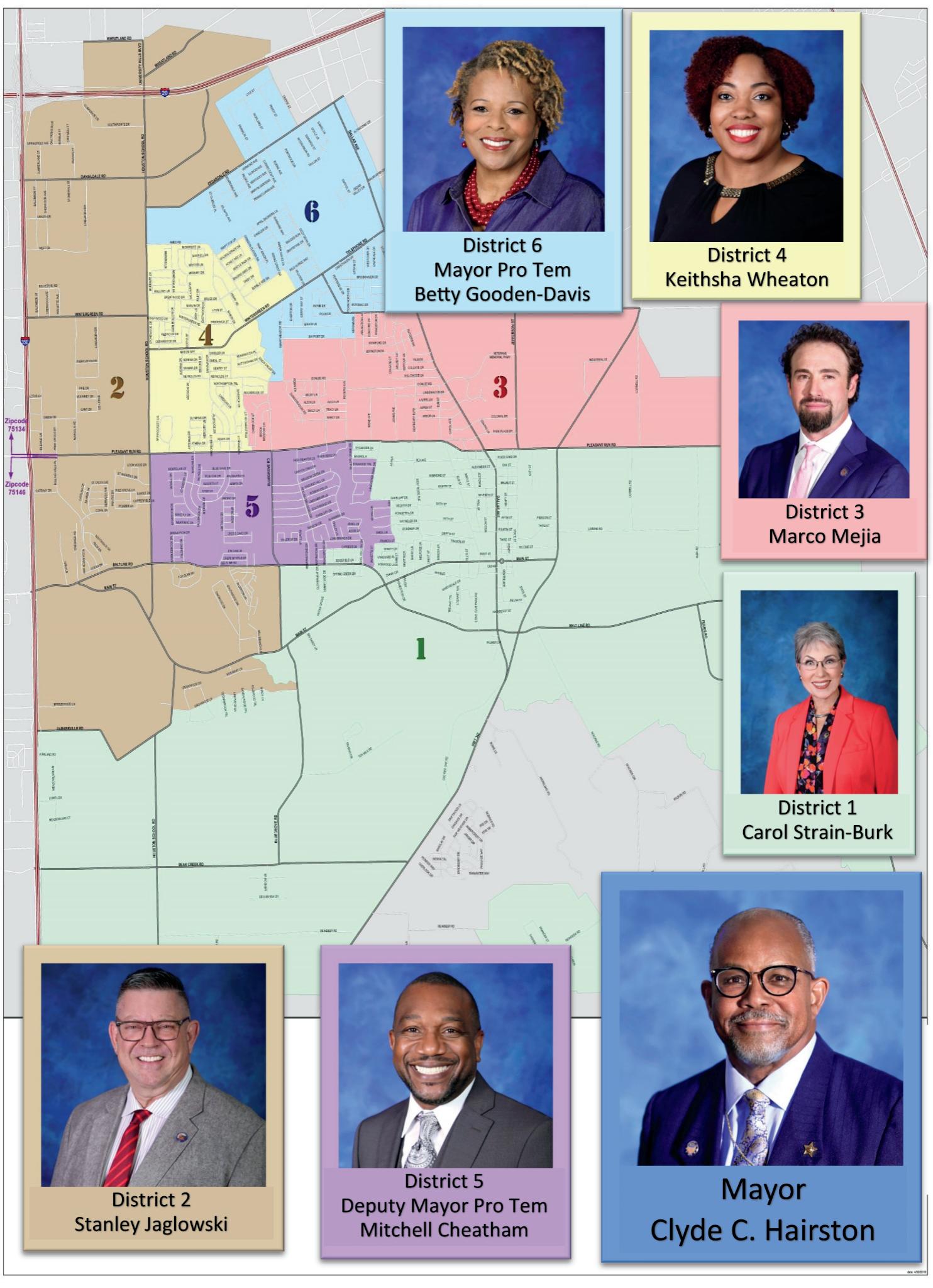 Front Row (L-R): Deputy Mayor Pro Tem Mitchell Cheatham (District 5), Councilmember Carol Strain-Burk (District 1), Mayor Clyde C Hairston Back Row (L-R): Councilmember Stanley Jaglowski (District 2), Mayor Pro Tem Betty Gooden-Davis (District 6), Councilmember Marco Mejia (District 3), Councilmember Derrick Robinson (District 4)