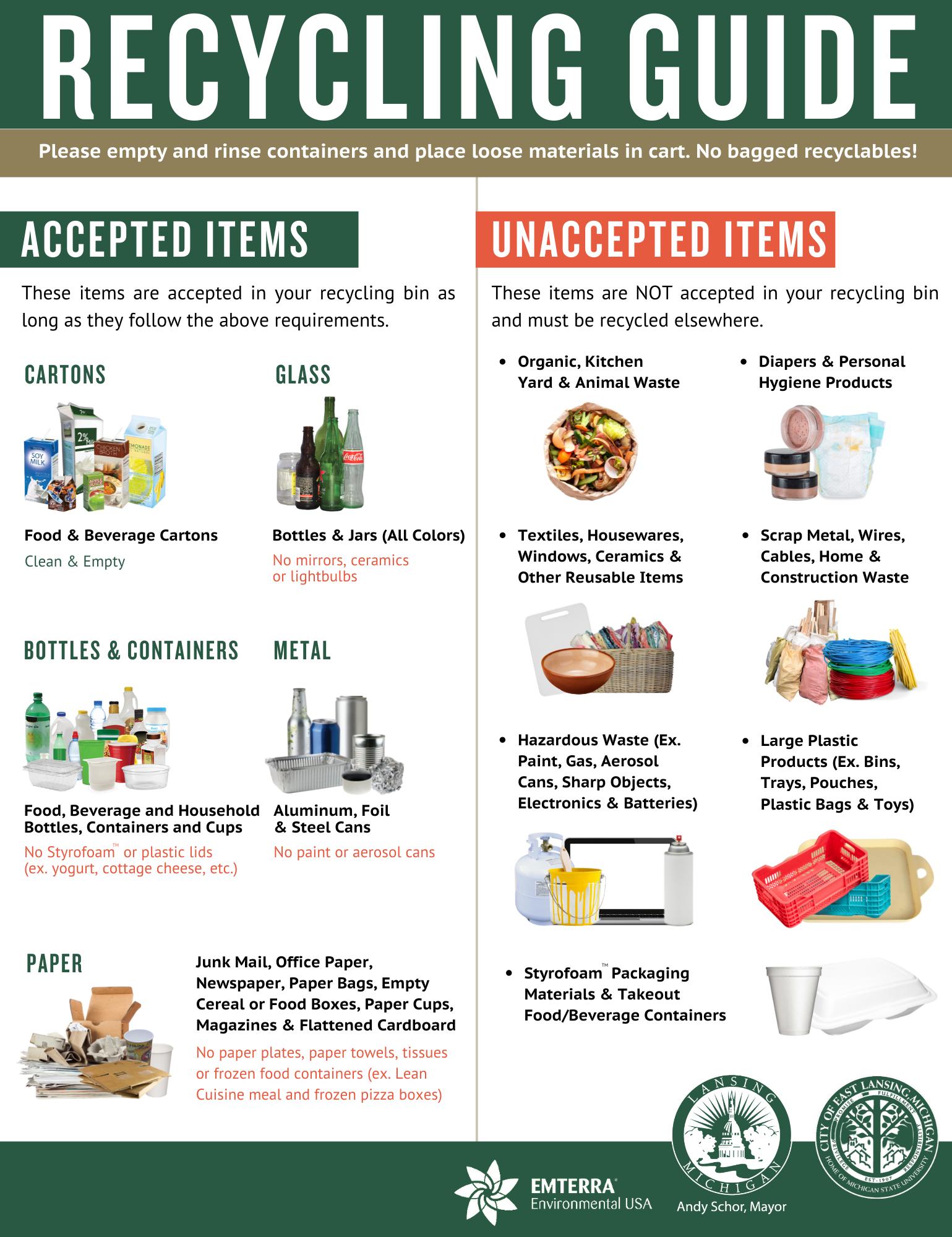 In here you will find the Lansing Parks and Recreation Activities Guide, the Capital Area Recycling and Trash (CART) Greensheet and other information from the City of Lansing.