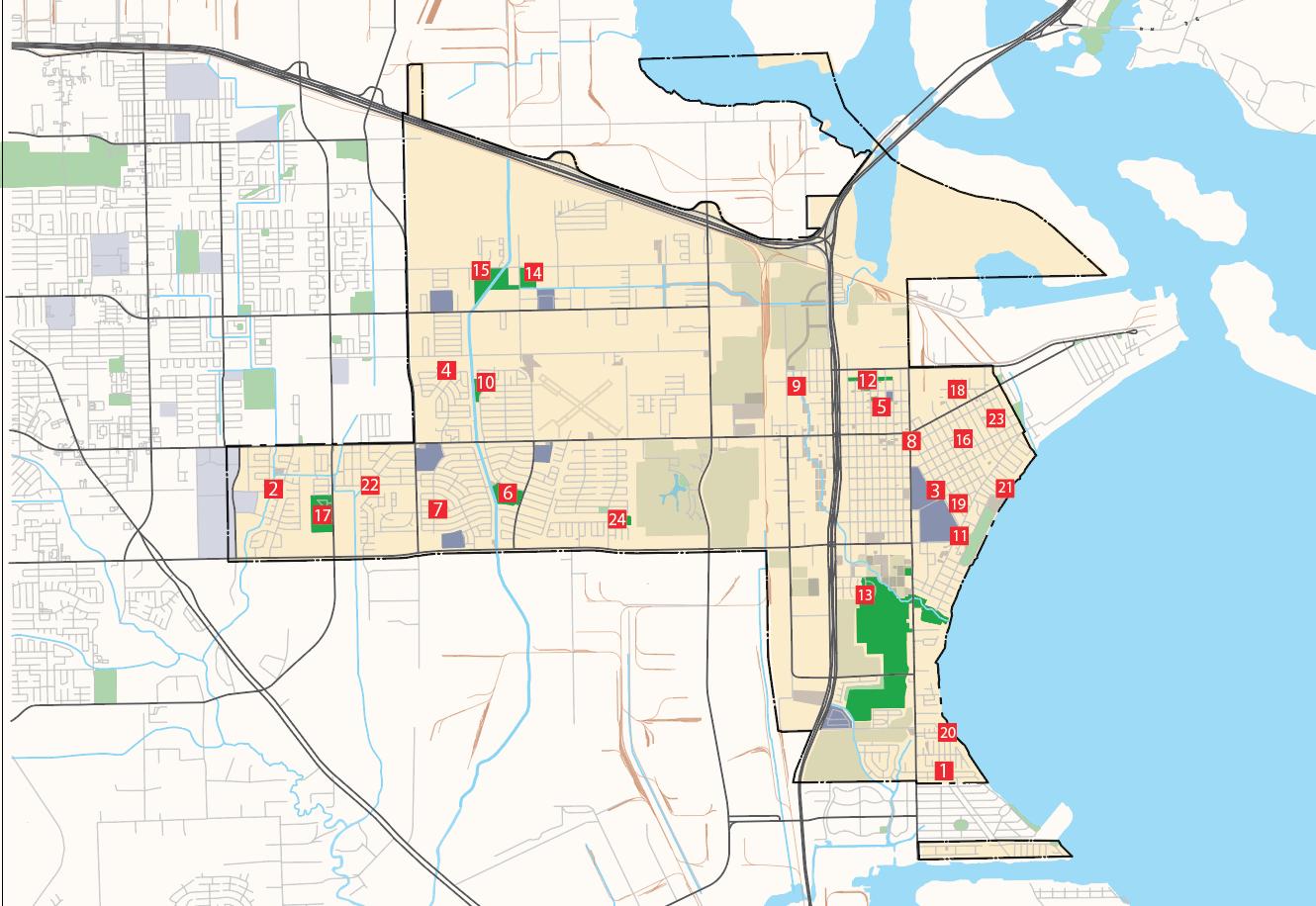 2. Brookglen 3324 Somerton 1. Bay Oaks 254 Dwire Drive 3. Central 618 San Jacinto 4. Creekmont 700 Williow Creek Drive 5. Dr. MLK Jr. 322 N 4th Street 6. Fairmont 3540 Farrington 7. Monarch Park 9801 Rustic Gate 8. Five Points Plaza 100 Broadway 9. Fourteenth Street 500 N. 14th Street 10. Glen Meadows 801 Valley Brook 11. Heritage 604 Park Drive 12. Linear N 2nd to N 8th Street 13. Little Cedar Bayou 600 Little Cedar Bayou Drive 14. Lomax 1508 Lomax School Road 15. Northwest 10210 N P Street 16. Ohio 300 S. Ohio Street 17. Pecan 3600 Canada Road 18. Pete Gilliam 200 N. Holmes 19. Pfeiffer 900 S. Virginia 20. Pine Bluff 1 Bayshore Drive 21. Seabreeze 1300 Bayshore Drive 22. Spenwick 9225 Carlow 23. Tom Brown 300 South Lobit 24. Woodfalls 3801 1/2 Driftwood