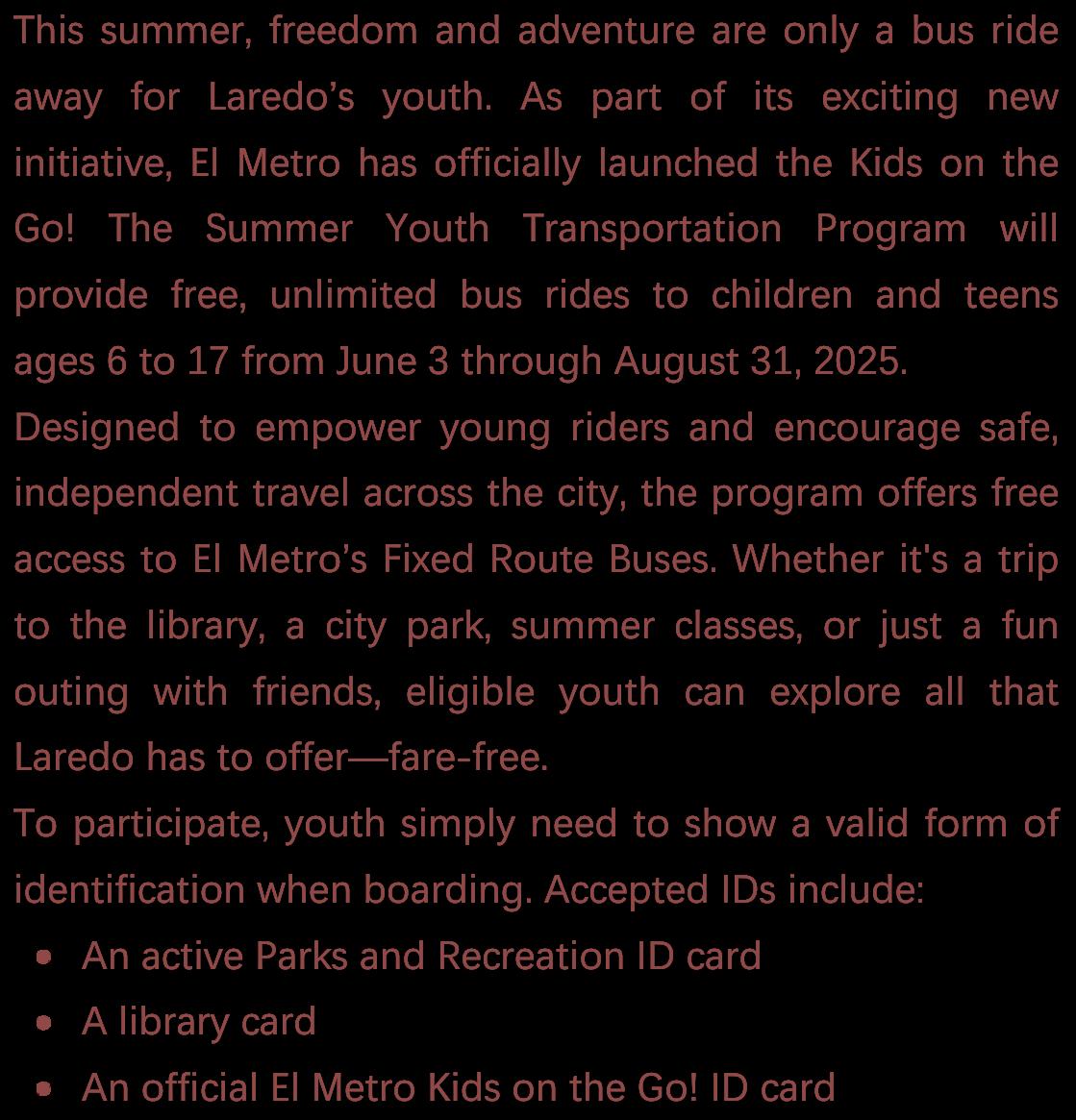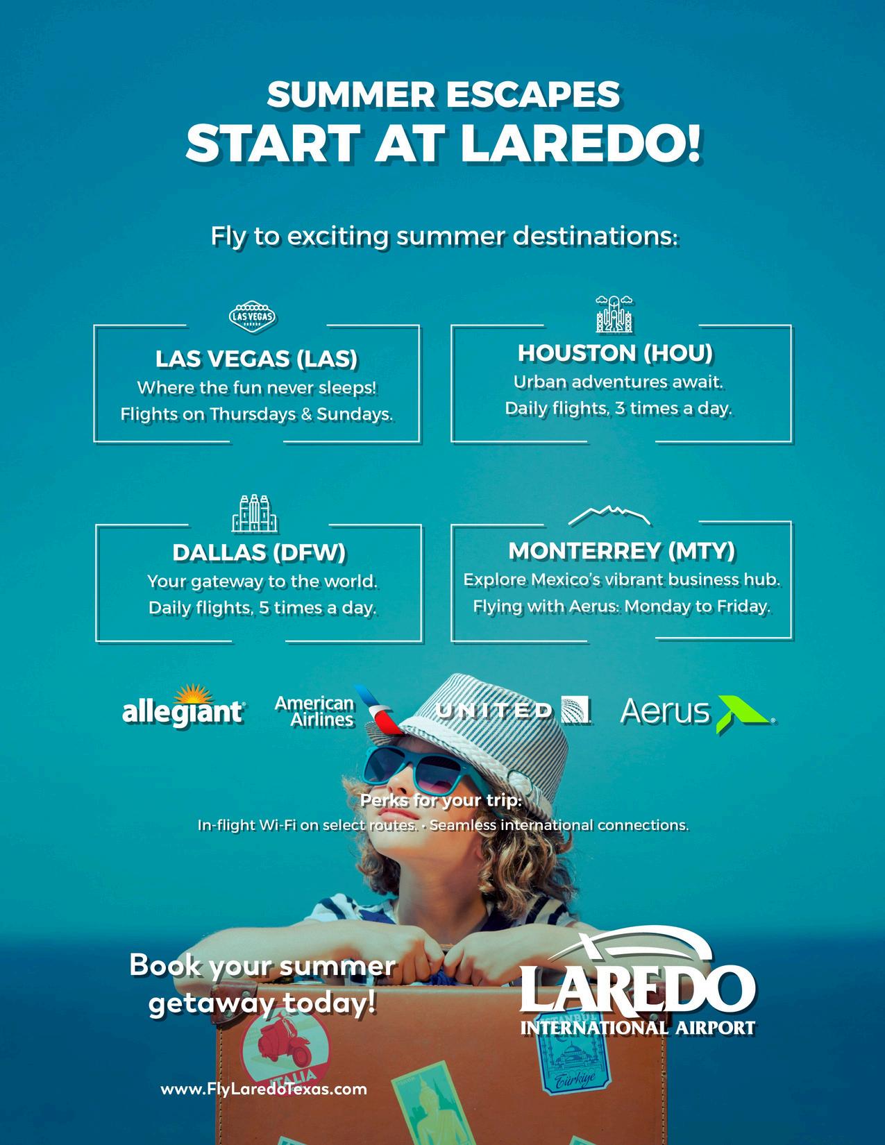 Summer safety tips from our Fire Departments, Convenient travel updates from the Laredo International Airport, A growing list of events from ASM Global and the Sister Cities Festival, Free back-to-school health services, And much more from departments across the city, all working together to help you make the most of this season.