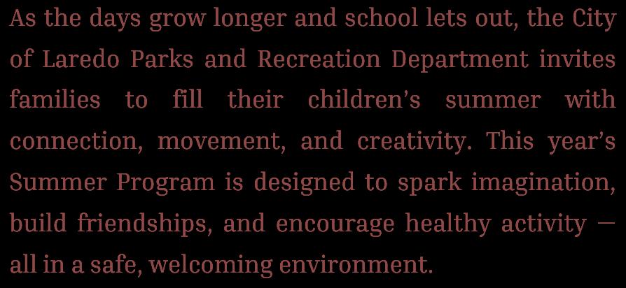 Cada experiencia de verano será adaptada según la edad, brindando actividades que impulsan el desarrollo personal y social a través del juego Con la combinación perfecta de estructura y diversión, el Programa de Verano sigue siendo uno de los favoritos entre las familias de Laredo. Para más información, llama al 956-729-4600 o visita www laredoparksandrec com