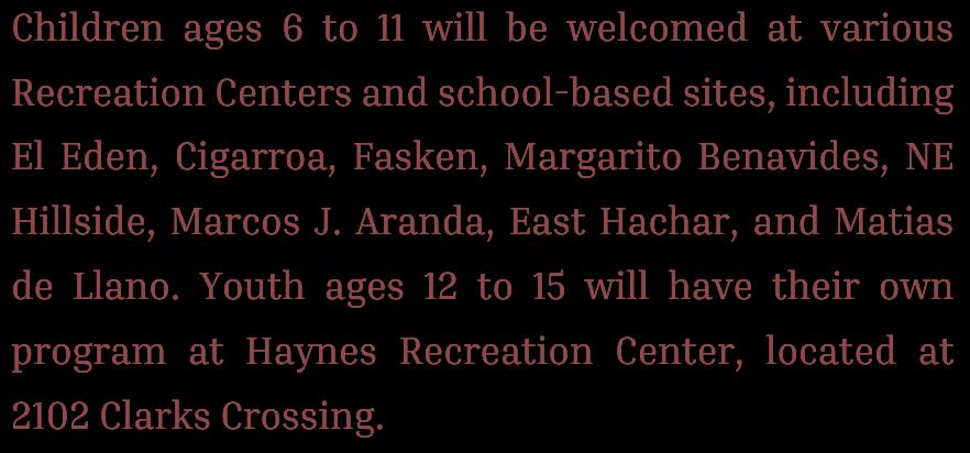 Los niños de 6 a 11 años podrán participar en distintos centros comunitarios y escuelas como El Eden, Cigarroa, Fasken, Margarito Benavides, NE Hillside, Marcos J Aranda, East Hachar y Matías de Llano. Por su parte, los jóvenes de 12 a 15 años disfrutarán su verano en el Centro Recreativo Haynes, ubicado en el 2102 Clarks Crossing