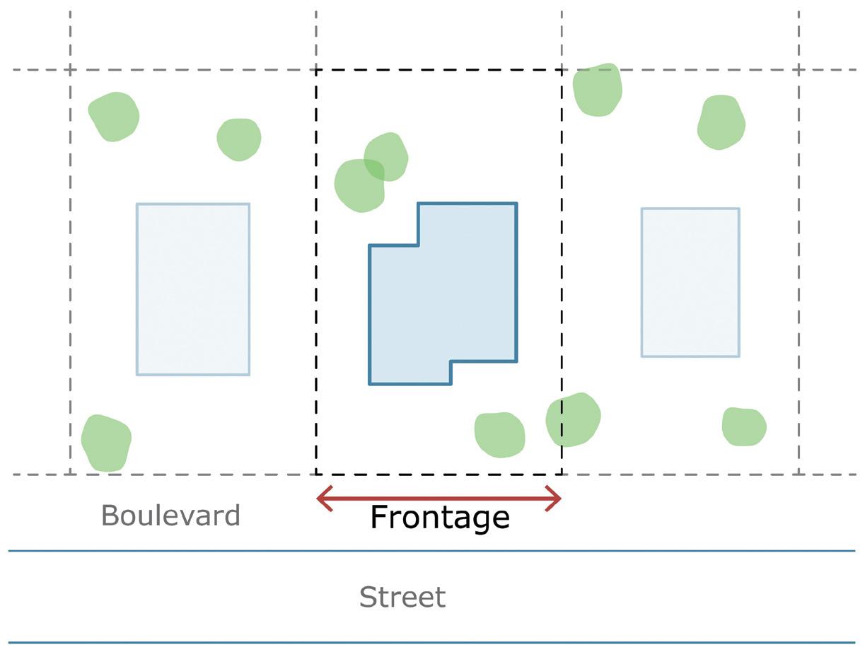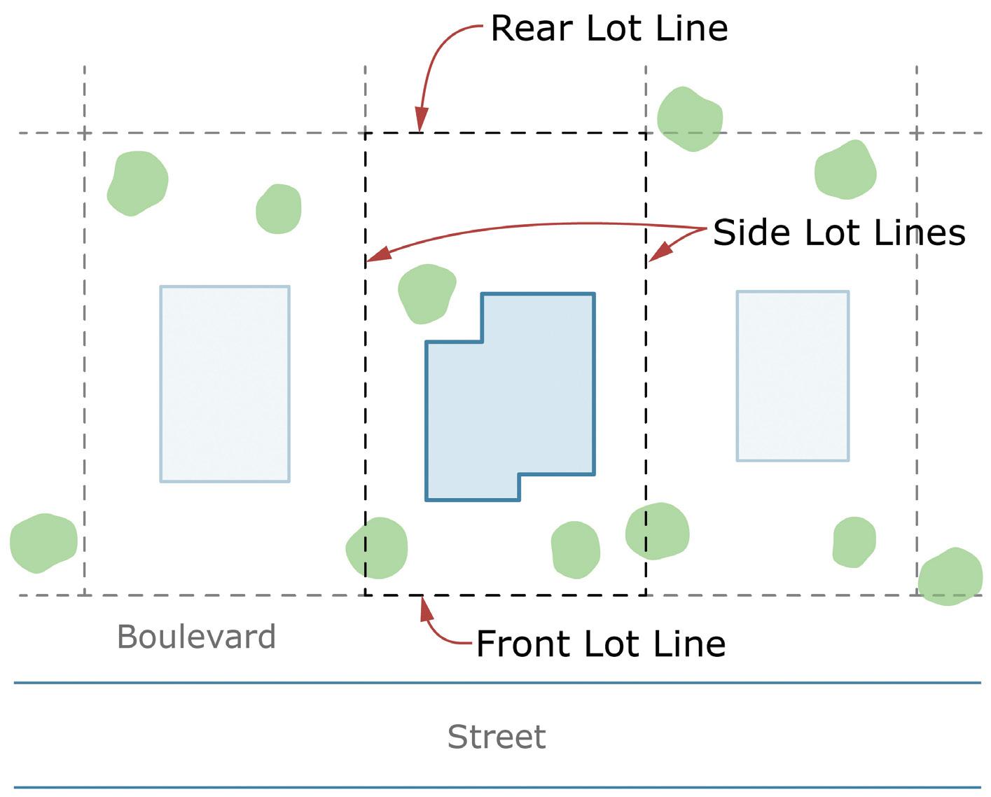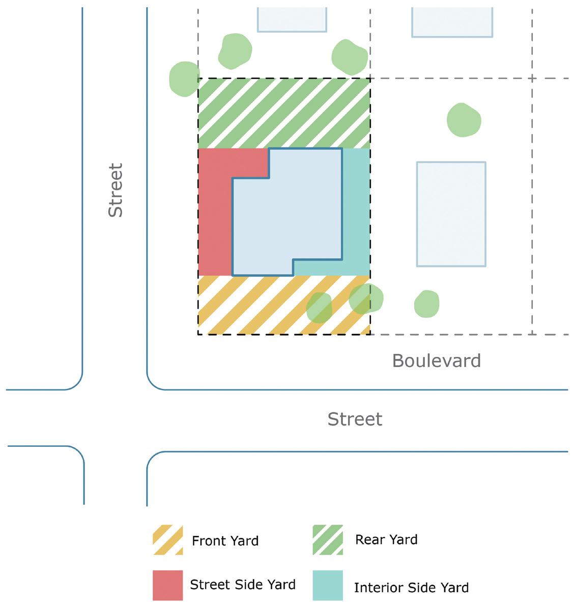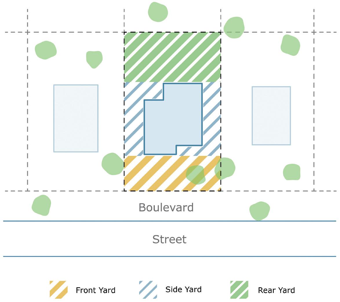 The portion of a site not occupied by buildings. Sites may have front, rear, or side yards. This does not include a site’s boulevard.