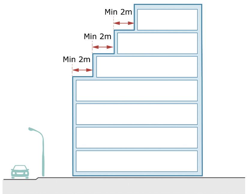 Horizontal distance a building façade is stepped back or recessed, on a horizontal plane, from the building façade immediately below it.