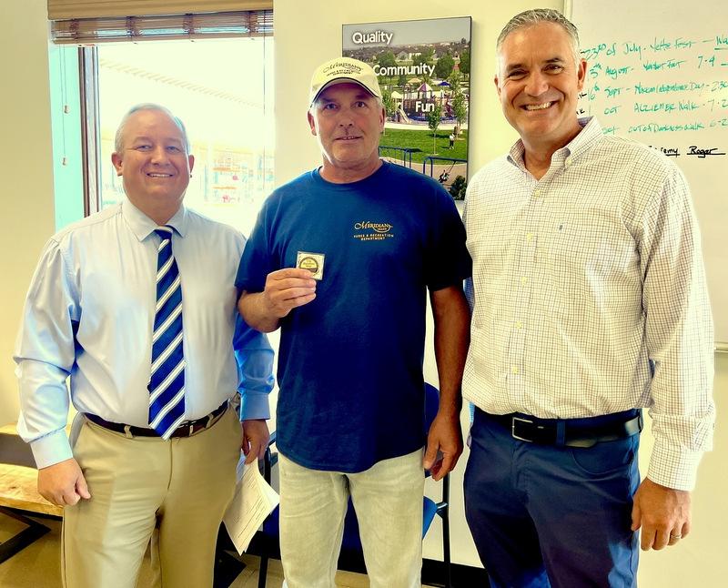 Meridian Mayor Robert Simison also honored seasonal staff members Daryl Freter (pictured below left) and Stirling Hadley (not pictured) with Meridian Way Coins for their role in assisting a resident who needed help with her child during a visit to Settlers Park.