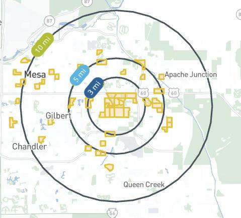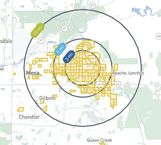 The proposed future east branch service zone has a population of 109,211 within a three-mile radius as of 2024. The fastest growing, and highest population, densities of this zone is the urban center along Broadway Road and the Superstition Freeway that includes urban and mixed use residential with a mix of traditional residential placetypes. Future library locations can benefit from being adjacent to urban and neighborhood centers identified in the Mesa General Plan.