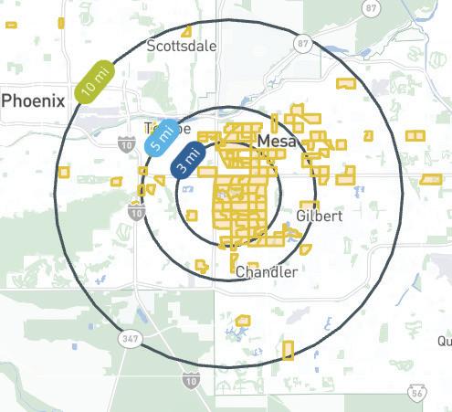 A three-mile radius is equivalent to a 10-minute drive in a typical urban setting. This is a useful planning tool as it represents the distance the average person is willing to drive on a regular basis for services. When the three-mile radii for Mesa’s existing branch libraries are placed on a map it begins to identify service gaps in the existing library system. The Mesa Express Library service zone is reduced to a one-mile radius because it is not a full-service branch and has a more localized service impact.