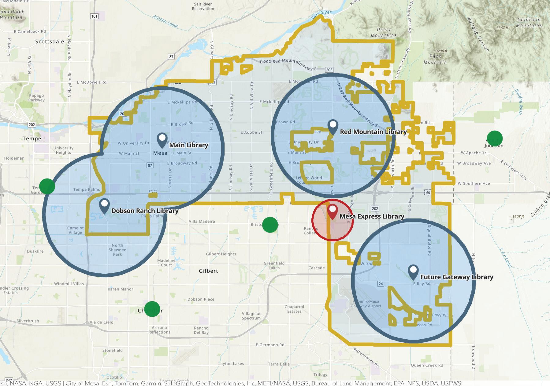 The City of Mesa had an estimated population of 521,604 residents do not live within a 3-mile radius, or roughly 10 minutes, of a library.