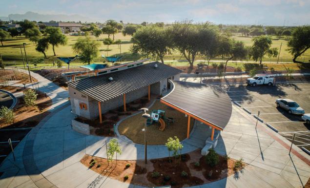 The Mesa Express Library was built in partnership with the Mesa Parks and Recreation Department. The park and library share public restrooms and the library benefits from additional eyes on the building from parks users and security staff.