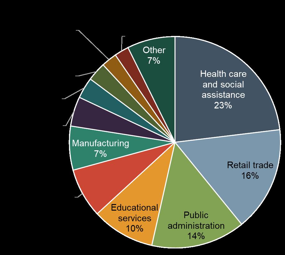 • Employment is concentrated in health care and social assistance, retail trade, public administration, educational services, and accommodation and food services.
