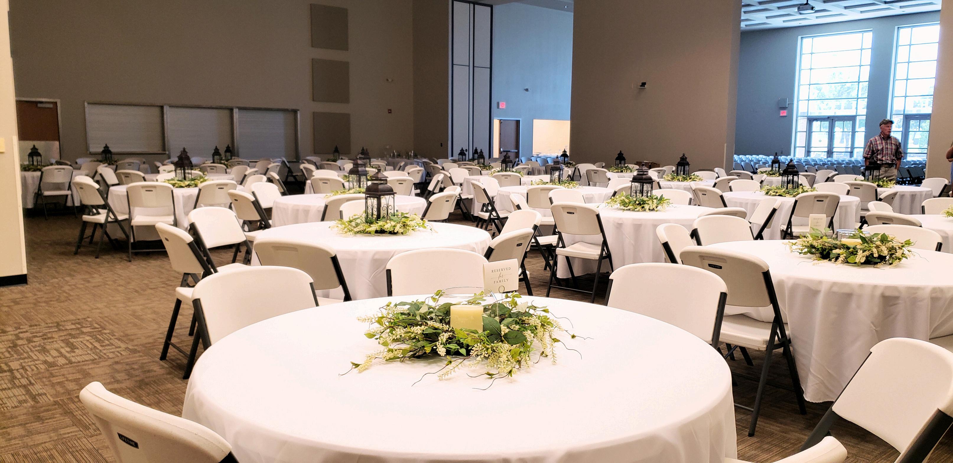 There are a variety of tables sizes available, depending which room is rented: 6’ x 30” x 30” rectangular tables are available in any room. 6’ x 19” x 30” rectangular tables are available in the Meeting Rooms. 5’ x 30” round tables are available in the Banquet Halls and Great Room only.