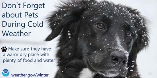 Stay inside: Cats and dogs should be kept inside during cold weather. It’s a common belief that dogs and cats are more resistant than people to cold weather because of their fur, but it’s untrue. Like people, cats and dogs are susceptible to frostbite and hypothermia and should be kept inside. Longer-haired and thickcoated breeds, such as huskies and other dogs bred for colder climates, are more tolerant of cold weather; but no pet should be left outside for long periods of time in below-freezing weather.