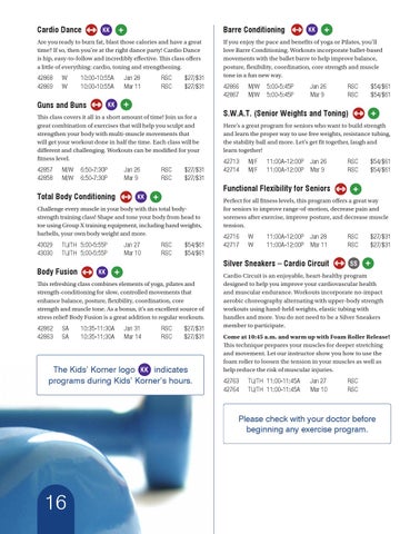 If you enjoy the pace and benefits of yoga or Pilates, you’ll love Barre Conditioning. Workouts incorporate ballet-based movements with the ballet barre to help improve balance, posture, flexibility, coordination, core strength and muscle tone in a fun new way. 42866 42867
