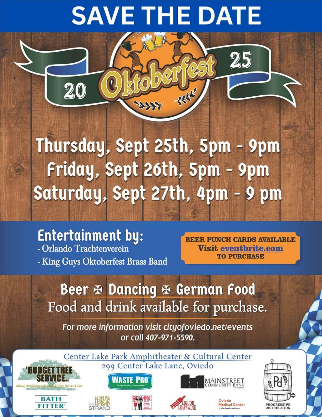 Beer = Dancing = German Food Foodrand drink available for purchase. For more information visit cityofoviedo.net/events or call 407-971-5590.