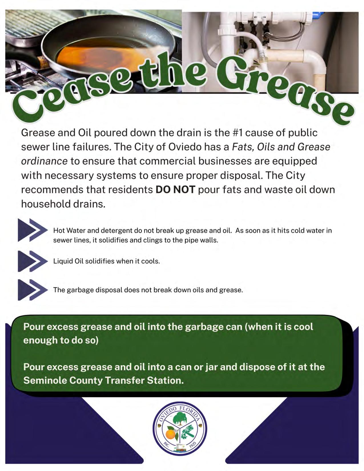 Grease and Oil poured down the drain is the #1 cause of public sewer line failures. The City of Oviedo has a Fats, Oils and Grease ordinance to ensure that commercial businesses are equipped with necessary systems to ensure proper disposal. The City recommends that residents DO NOT pour fats and waste oil down household drains.