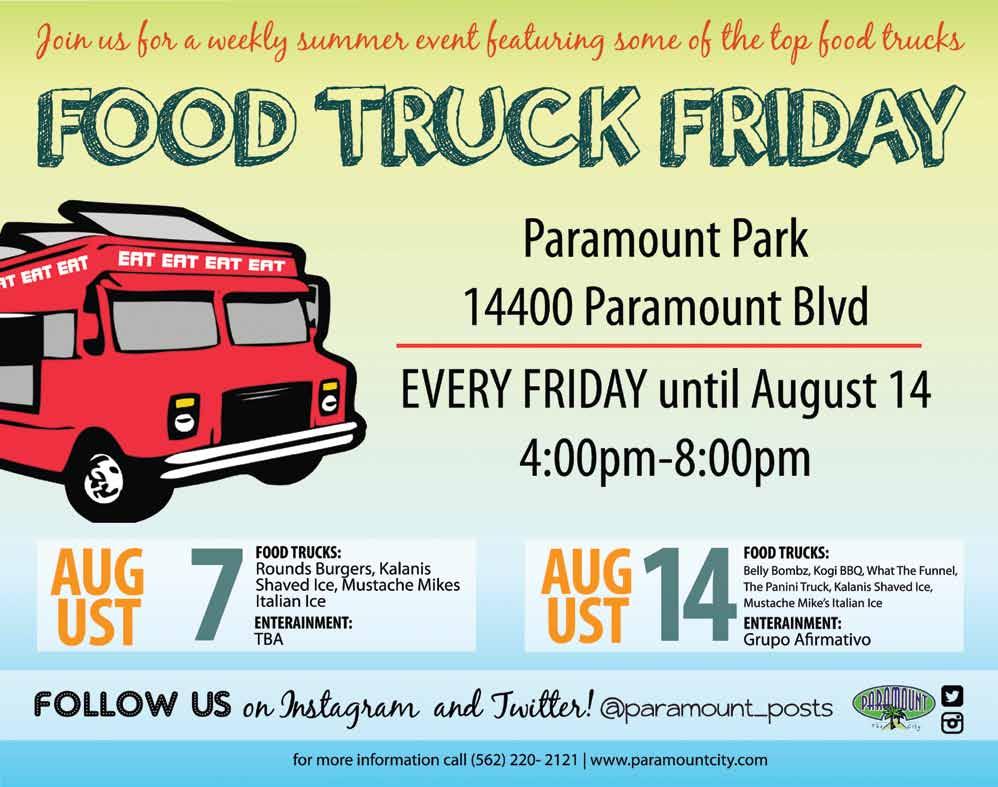 You’re got two more weeks left to enjoy al fresco dining in Paramount Park with Food Truck Friday on Aug. 7 and 14. The trucks will be in the park from 4:00 p.m. to 8:00 p.m.