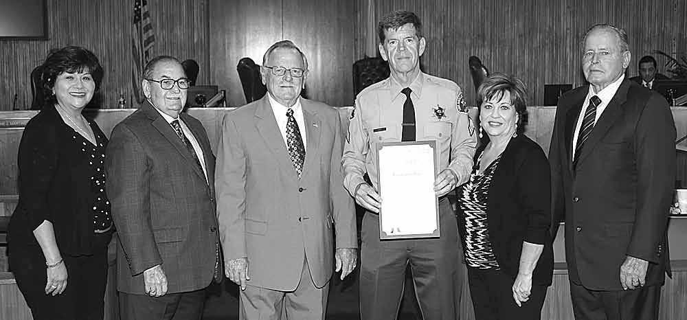 At its November 3rd meeting, the Paramount City Council recognized Detective Michael Smith, a member of the Sheriff’s Department’s Detective Bureau in Paramount since 2007, for his exemplary work in making the community a safer place over the years. Detective Smith was reassigned to South Los Angeles this past September. From left: Councilmember Diane J. Martinez, Councilmember Gene Daniels, Mayor Tom Hansen, Detective Smith, Councilmember Peggy Lemons, and Vice Mayor Daryl Hofmeyer.