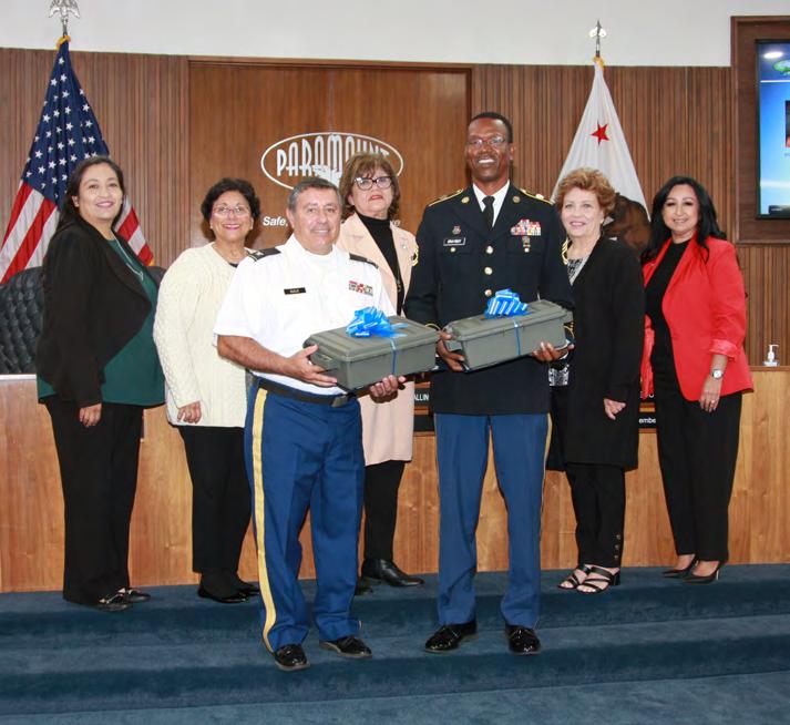 Robert Guild and Sergeant 1st Class Dannie Brayboy were recognized at the Paramount City Council’s November 8 meeting for their work with the Paramount High School JROTC over the last 15 years upon their retirements from the program. During the tenure of the Colonel and the Sergeant, about 2,000 students enrolled in JROTC and performed 2,500 hours of community service. Graduation rates for their students have risen to 95% and the cadets have won recognition from the military and the community. From left: Vice Mayor Isabel Aguayo, Councilmember Annette C. Delgadillo, Colonel Guild, Mayor Vilma Cuellar Stallings, Sergeant Brayboy, Councilmember Peggy Lemons, and Councilmember Brenda Olmos.