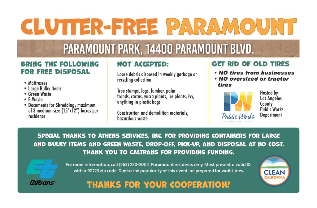 Clear out your post-holiday build-up at the City’s next Clutter-Free Paramount community-wide cleanup event on Saturday, January 14, 2023, from 8 a.m. until noon at Paramount Park. Please see City Scape on page 13 for all the details abut what to bring and not bring.