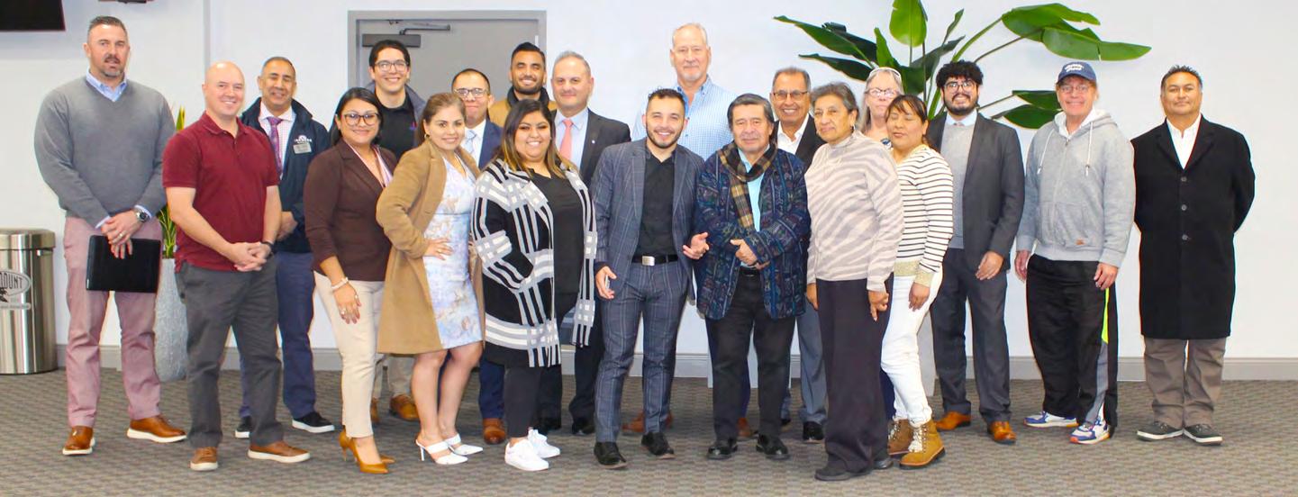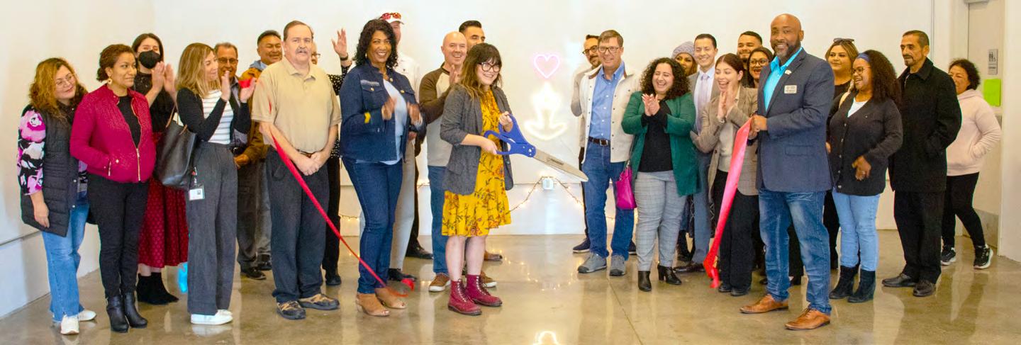 Shown at right (left to right): Barbara Crowson (Paramount Chamber of Commerce), Lauren Yokomizo (representing Los Angeles County Supervisor Janice Hahn), SolBejarano (representing the City of Paramount), Clarissa Cota (My Communidad Foundation), Jayro Sandoval (representing State Senator Lena Gonzalez), Gabriela Ballesteros (representing State Assembly Speaker Anthony Rendon) and Chamber of Commerce President Chris Rich (WaveFront Technology).