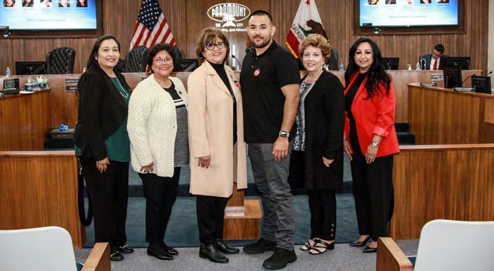 IIncelebration of Veterans Day, the Paramount City Council highlighted the work of The Veteran Peer Access Network (VPAN), which serves local veterans and their families, at its November 8 meeting. Bryan Palomero, the organization’s housing coordinator and a Marine Corps vet, led the Pledge of Allegiance at the meeting. Los Angeles County is home to the highest concentration of military veterans in the nation. VPAN staff members are veterans helping other veterans to receive the services they deserve in areas like mental health, substance misuse, housing, employment, healthcare, legal services, food, and much more. They can be reached at (800) 854-7771, from 9a.m. to 9 p.m., seven days a week, or in person on Mondays and Fridays at the Paramount Park Community Center, 14400 Paramount Blvd. From left: Vice Mayor Isabel Aguayo, Councilmember Annette C. Delgadillo, Mayor Vilma Cuellar Stallings, Palomero, Councilmember Peggy Lemons, and Councilmember Brenda Olmos.