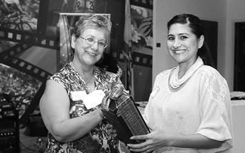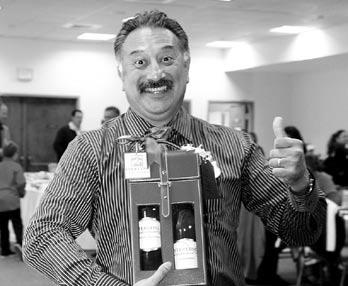 George Ahumada (Stolen From Heaven) picks up his raffle prize from Maria Villasenor (Paramount Chamber) with help from Ambassador Grace Padilla (Marukan Vinegar).