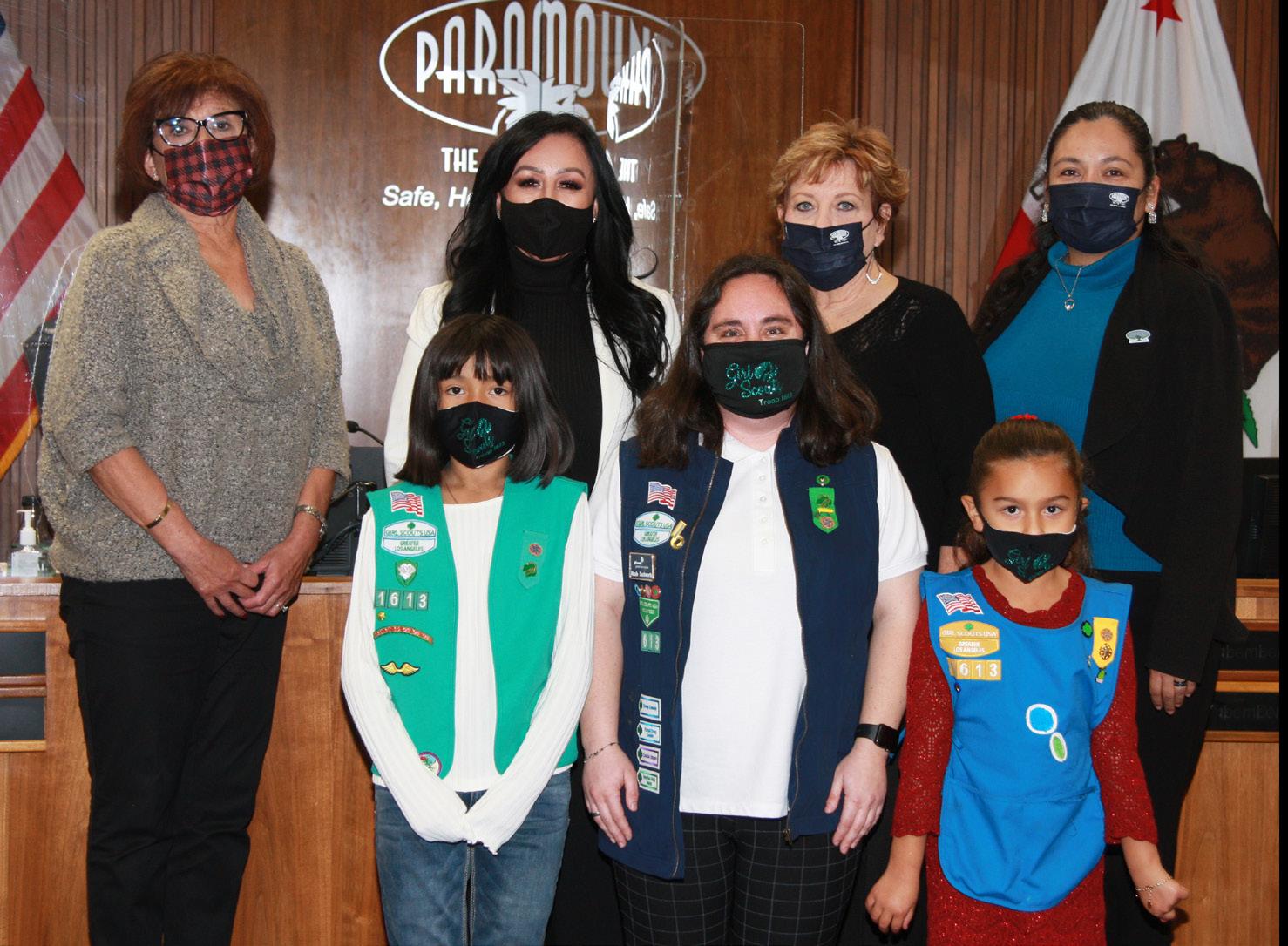 Nicole Duckworth, leader of Paramount’s Girl Scouts Troop 1613, along with Troop members Lucy and Maddie, led the Pledge of Allegiance to start off the December 14 Paramount City Council meeting. Girl Scouts cookie months begin in January. Back row, from left: Vice Mayor Vilma Cuellar Stallings, Mayor Brenda Olmos, Councilmember Peggy Lemons, and Councilmember Isabel Aguayo. Front row, from left: Lucy, Duckworth, Maddie.