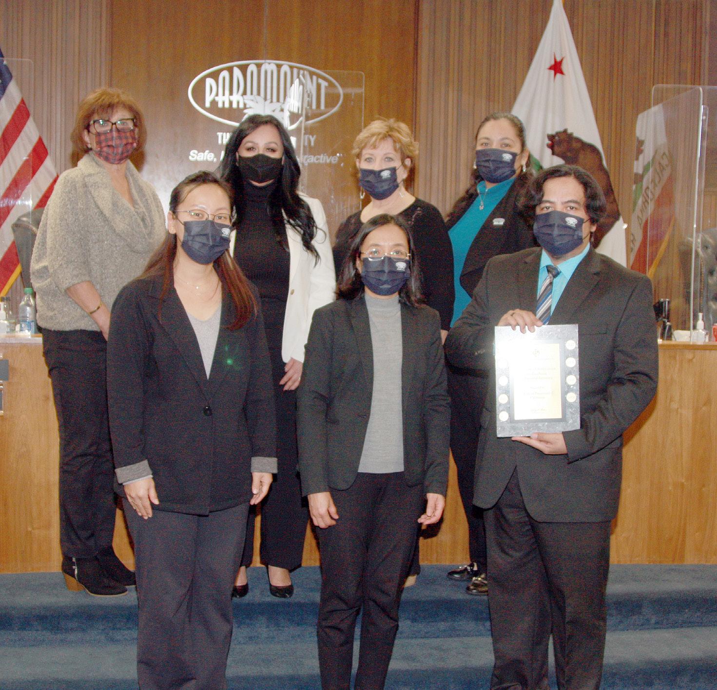 The Paramount City Council and City staff have a long history of managing the public’s money conservatively and responsibly. As part of this process, the Finance Department produces an Annual Comprehensive Financial Report (ACFR). These reports have received awards for excellence over the last three decades from the Government Finance Officers Association, a non-profit organization made up of professionals throughout California. The City’s Finance Department was honored again for the 2020 ACFR. At the December 14 City Council meeting, Kinnaly Soukhaseum, a partner with the accounting firm of Eide Bailly, LLP and a member of the Association presented the award via Zoom. From left, back row: Vice Mayor Vilma Cuellar Stallings, Mayor Brenda Olmos, Councilmember Peggy Lemons, and Councilmember Isabel Aguayo. From left, front row: Senior Accountant Joanne Cha, Interim Finance Director Clyde Alexander, and Senior Accountant Jaime De Guzman.