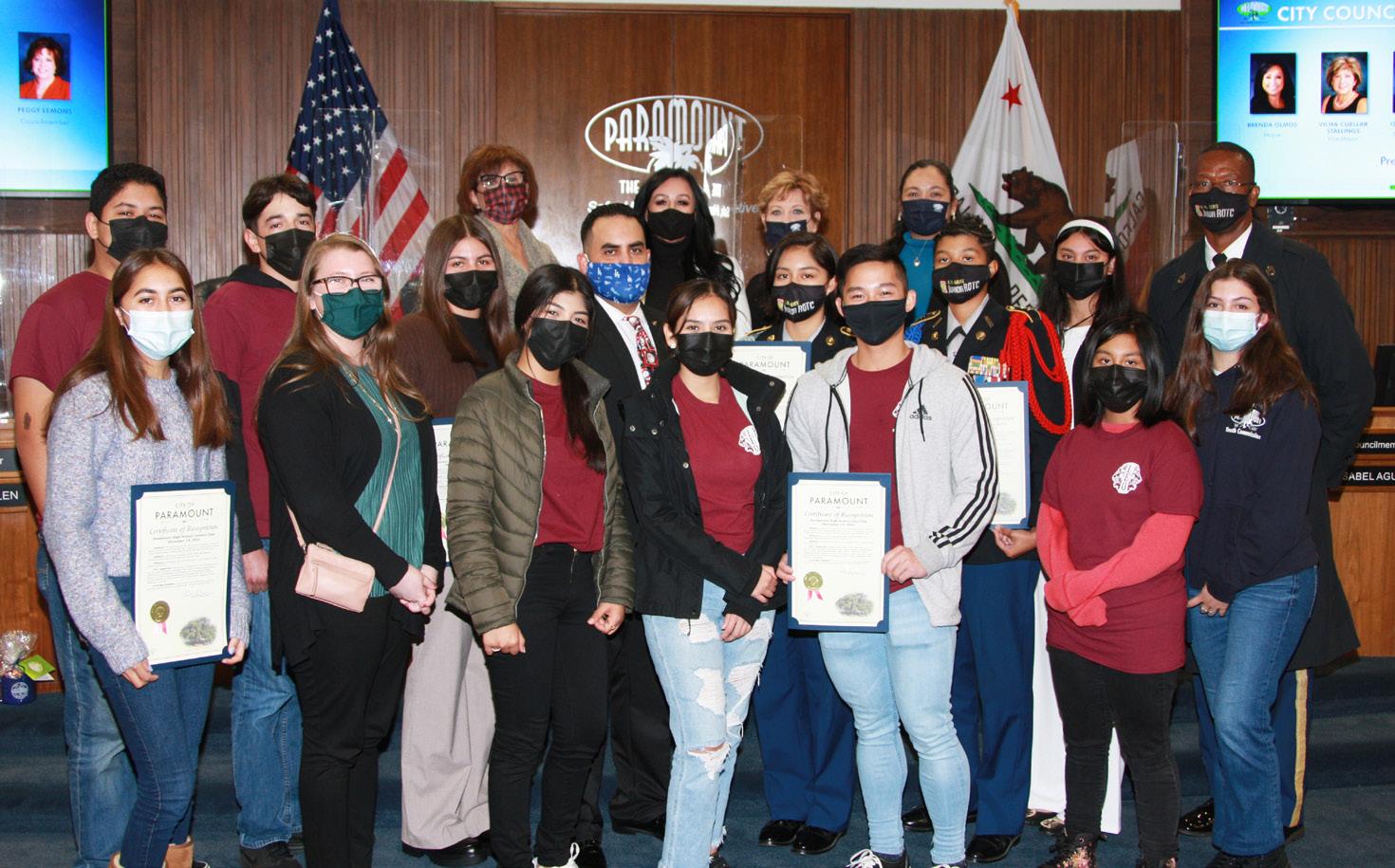 Throughout the year, the City of Paramount produces a number of special events at which City staff members get tremendous help from local volunteers. At the December 14 City Council meeting, the volunteers from the fall events were thanked. Those who worked the Halloween Festival, all from Paramount High School, were the ASB, Boys Soccer, Cheer, Girls Volleyball, Girls Wrestling, the Interact Club, JROTC, the Leo’s Club, the Mental Health Awareness Club, Raices Unidas, and the Youth Commission. At the Veterans Celebration, also from Paramount High, were Cheer, the Corsairs Club, JROTC, and the Youth Commission. At the Seniors Thanksgiving luncheon, the Corsairs and the Paramount Rotary Club.
