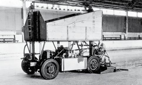 So Frank set out to create a faster, more efficient way. After nearly a decade of designing and experimenting, he build his self-propelled “Model A” ice resurfacer in 1949 using mostly war-surplus parts—including a Jeep engine and a hydraulic chamber from a Douglas A-20 bomber (see the top picture at the right).