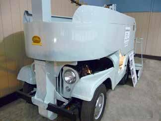 Although the schedule was very demanding, Frank saw this as an opportunity to improve his design. Instead of using a hand-built chassis, he decided to mount his apparatus directly onto an Army surplus Jeep modified to allow a driver to steer from the rear of the machine. He loaded the components of his resurfacer into a U-Haul trailer and towed it behind the Jeep, which he drove to Chicago, the location of Sonja Henie’s next show. He then installed the apparatus on the Jeep. It worked perfectly. (However, the owner of the stadium where the show was to take place was worried that people would stay in the stands and watch the unique machine instead of going to concession stands!)