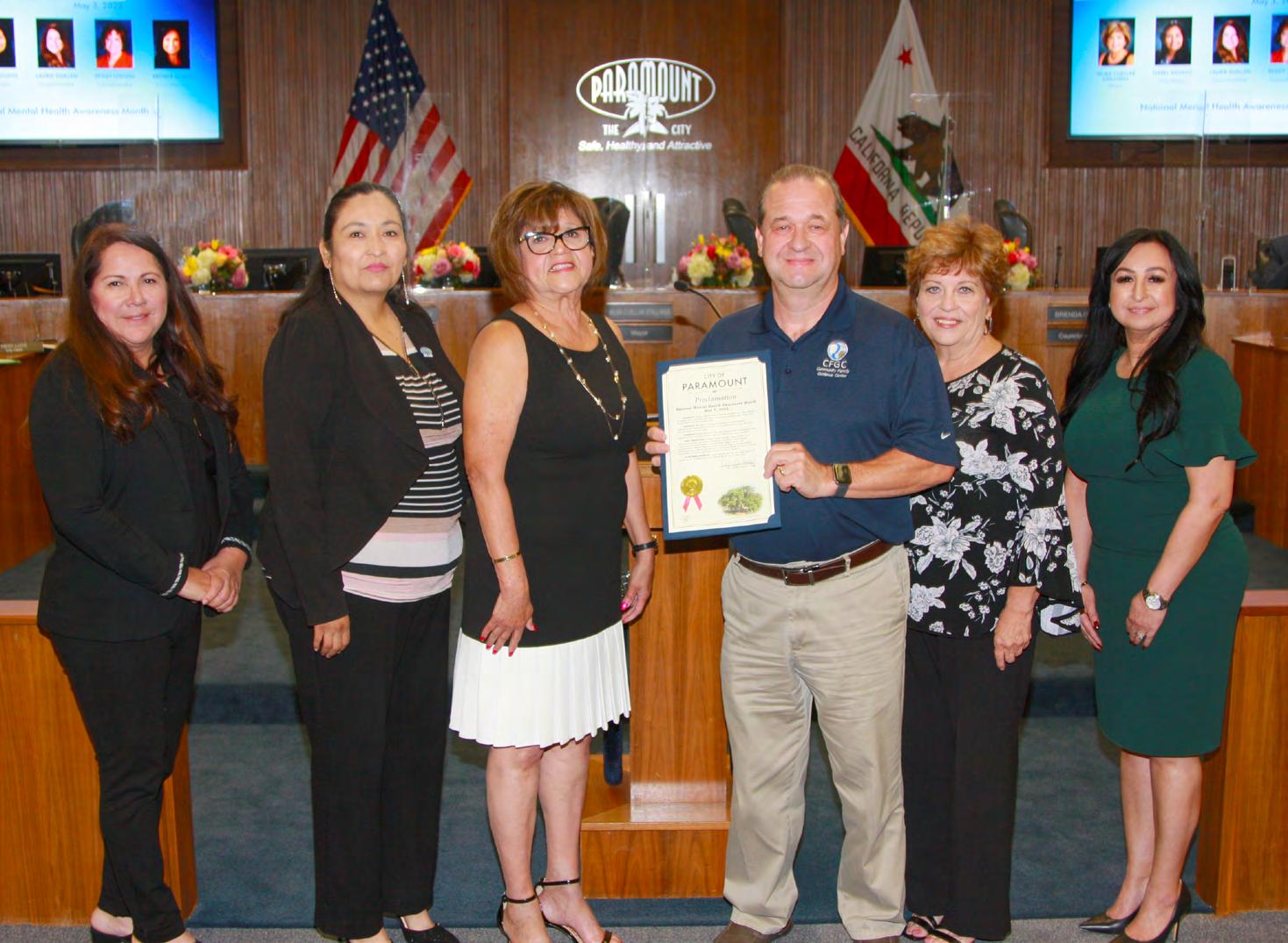 May was proclaimed as National Mental Health Awareness Month with a message of “Together in Mental Health” and the goal of raising awareness by educating the public. Bill Sinko, Executive Director of Community Family Guidance Center, which offers services to Paramount’s young people, accepted the proclamation. From left: Councilmember Laurie Guillen, Vice Mayor Isabel Aguayo, Mayor Vilma Cuellar Stallings, Sinko, Councilmember Peggy Lemons, and Councilmember Brenda Olmos.