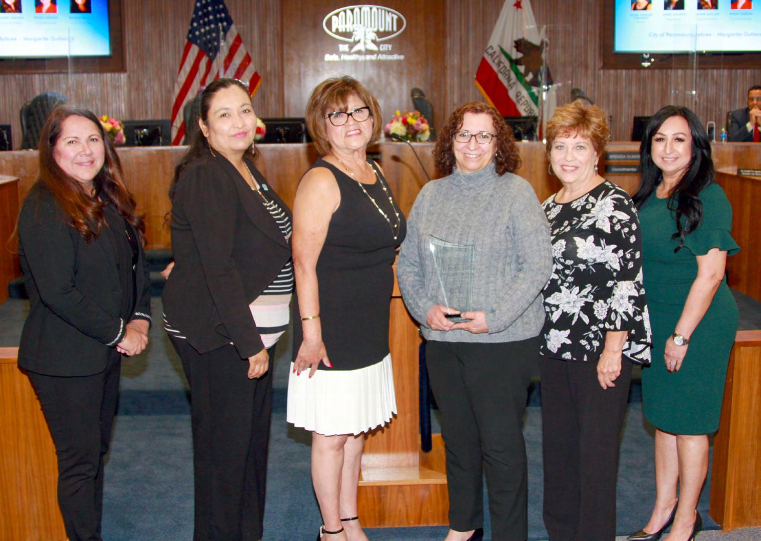 Margarita Gutierrez, who was hired by the City in 2005 as an Office Aide and quickly promoted to Finance Supervisor, was recognized upon her retirement. She led the City Hall front counter services and was well known to members of the community who conducted business there. From left: Councilmember Laurie Guillen, Vice Mayor Isabel Aguayo, Mayor Vilma Cuellar Stallings, Gutierrez, Councilmember Peggy Lemons, and Councilmember Brenda Olmos.