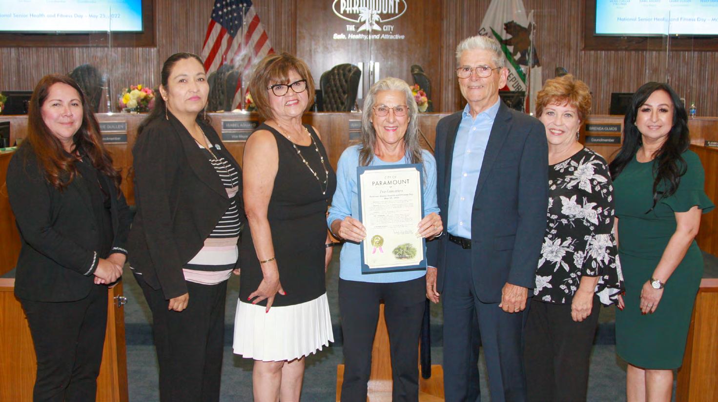 The City Council proclaimed May 25 as National Senior Health and Fitness Day. This observance promotes the importance of regular physical activity for older individuals. Mayor Vilma Cuellar Stallings noted that the City offers activities for older residents all year at the Senior Center in the Paramount Park Community Center. Residents Pat and Ken Winieki, who lead the Senior Walking Club at the park, received the proclamation. From left: Councilmember Laurie Guillen, Vice Mayor Isabel Aguayo, Mayor Vilma Cuellar Stallings, the Winiekis, Councilmember Peggy Lemons, and Councilmember Brenda Olmos. (See related story on page 9).
