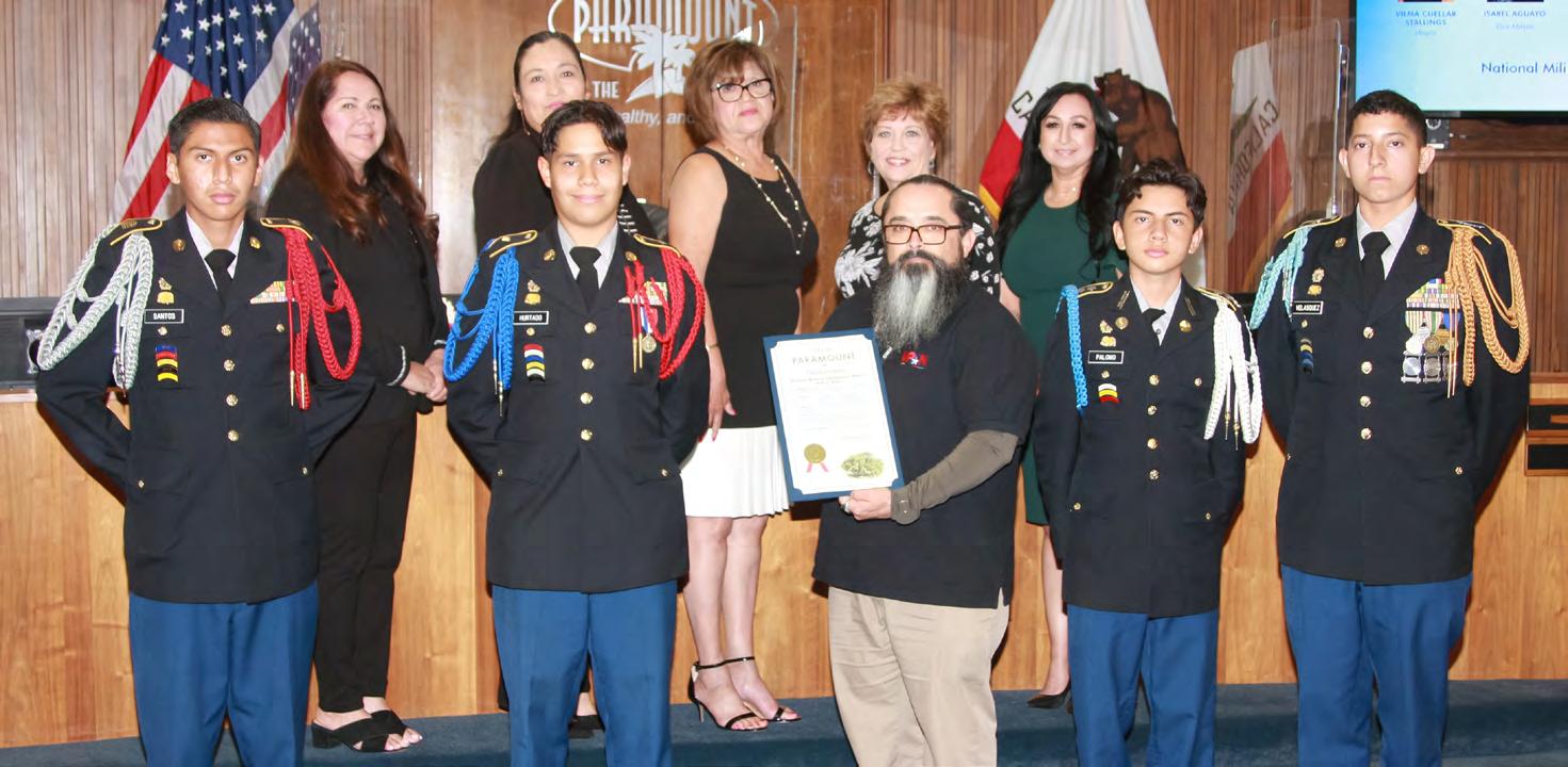 The City Council proclaimed May as National Military Appreciation Month, noting that the City honors its military heroes with the Veterans Memorial Plaza, recognition banners along the “Boulevard of Heroes” on Paramount Blvd., and at the annual Veterans Day celebration, which will be on November 12 this year. Adam Castillo of the Veterans Peer Access Network and members of the Paramount High School JROTC accepted the proclamation. The Veterans Peer Access Network is made up of veterans who help other veterans connect with support services. Cadet Major Jesus Hurtado (second from left) led the Pledge of Allegiance at the Council meeting.