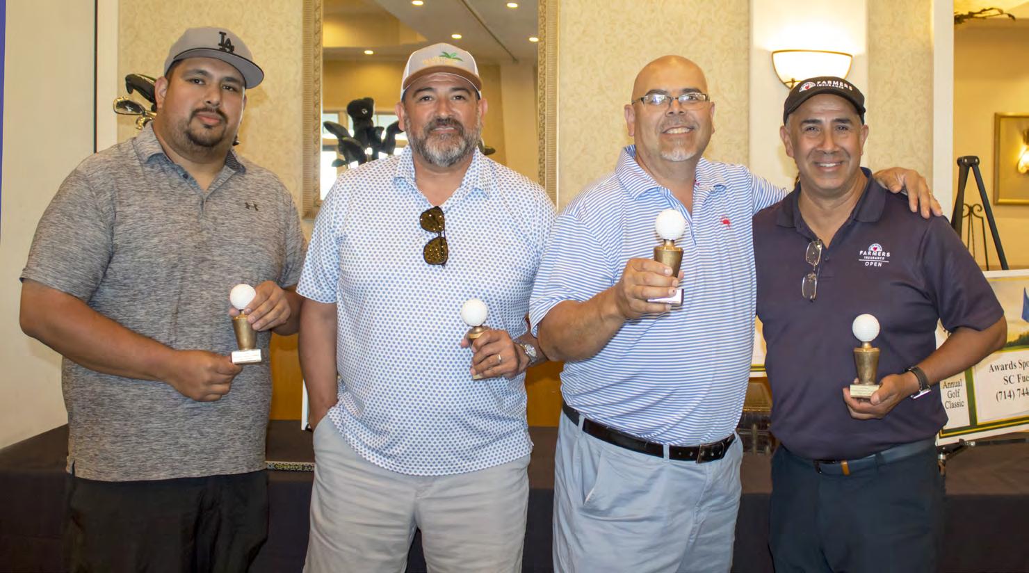 Getting ready to play (above, left to right): Ewin Medina (Medina Investments), Ted Viscarra (Chase Bank), Justin Doming (JP Plumbing Systems) and Matt Wagner (GM Properties).