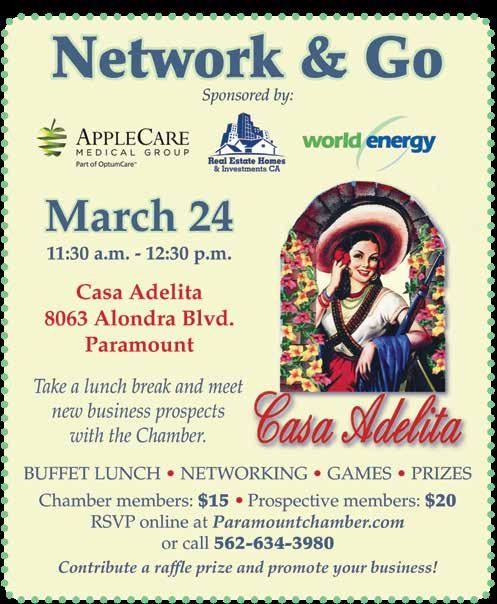 TParamount Chamber of Commerce and the Norwalk Chamber of Commerce jointly hosted a very successful “Creating Connections Luncheon” on February 25 at Frantone’s Restaurant in Cerritos. Those attending enjoyed lively exchanges and good food. Networking sponsors for the wellattended event were World Energy Paramount, AppleCare Medical Group and Real Estate Homes & Investments CA.