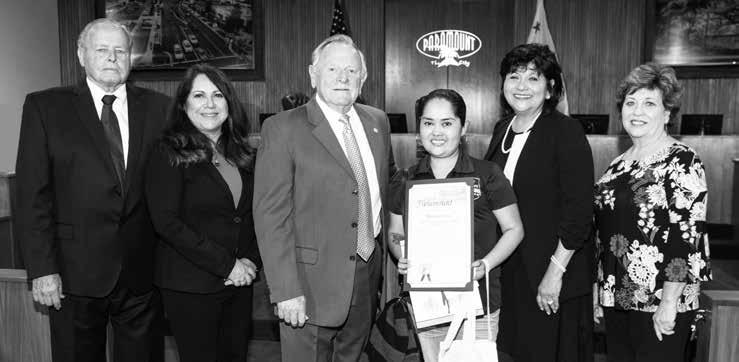 The City Council proclaimed April as DMV/Donate Life California Month in Paramount, which highlights the importance of organ, tissue, and blood donations. More than 100,000 people in America are waiting for an organ transplant, many of them in California. To become a donor, you can sign up when getting or renewing your driver’s license or ID card at the DMV. You can also do it online at donateLIFEcalifornia. org. Ambassador Paulina Guevara from the organization OneLegacy accepted the proclamation. From left: Vice Mayor Daryl Hofmeyer, Councilmember Laurie Guillen, Mayor Tom Hansen, Paulina Guevara, Councilmember Diane J. Martinez, and Councilmember Peggy Lemons.