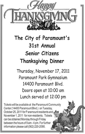 Coming up on Thursday, November 17th, the City will once again honor our senior citizens with its 31th Annual Thanksgiving Dinner, a free day of entertainment, dancing, raffle prizes and a fine meal with all the trimmings. The doors to the Paramount Park gym will open at 10 a.m., the meal will be served at noon, with the event scheduled to wrap up at 1 p.m.