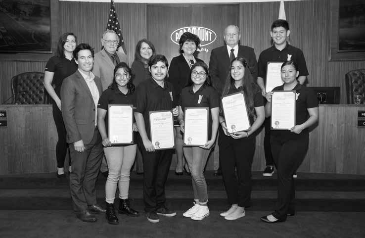 The seven Paramount students who took part this year in State Senator Ricardo Lara’s Young Senators Program were recognized at the October 2 Paramount City Council meeting. The Program provides high schoolers with insights about potential career and educational paths as they explore the industries, professions, and social innovations that are critical to California’s economy, meeting leaders of the state’s public and private sectors along the way. The Young Senators shared their experiences about the program with the Council. From left, back row: Brianna Fierro, Vice Mayor Tom Hansen, Councilmember Laurie Guillen, Mayor Diane J. Martinez, Councilmember Daryl Hofmeyer, and Raul Plascencia. From left, front row: Marc Hansen from the Senator’s office, Nicole Reyes, Josue Parra, Jaleen Perez, Luisa Gonzalez, and Jocelyn Munoz.