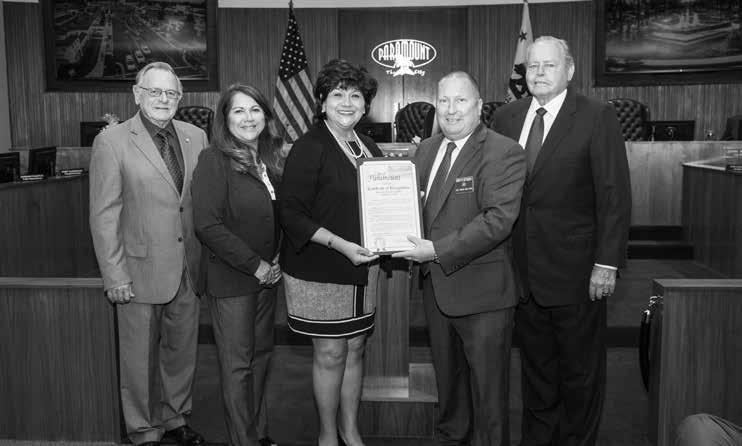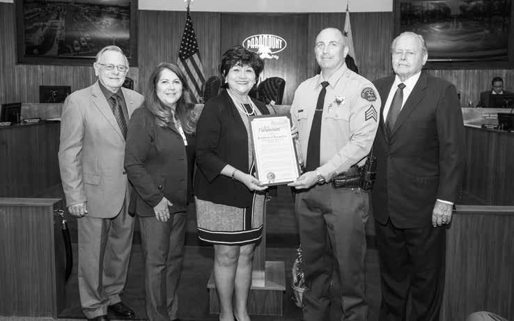 in the City at Progress Park. But as discovered by the detective, using superb interviewing skills and a strong sense of intuition, the person had actually shot himself in the leg in Long Beach. Detective Van Dyke’s perseverance and talent helped reveal the truth about a crime that allegedly took place in Paramount. From left: Vice Mayor Tom Hansen, Councilmember Laurie Guillen, Mayor Diane J.