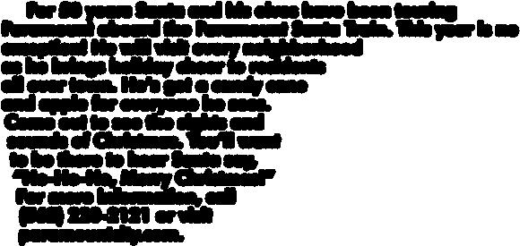Dates for the Santa Train will be Monday, Dec. 3 through Thursday, Dec. 6. For more information and a full schedule of stops, please see CityScape on the inside back page of this Pulse Beat, and look for the Around Town newsletter later in the month that will be delivered by mail to your home. You will also be able to find it at paramountcity.com.