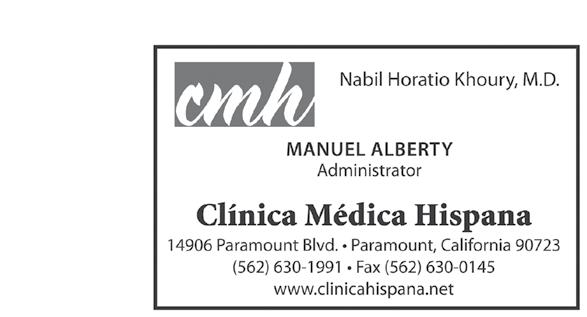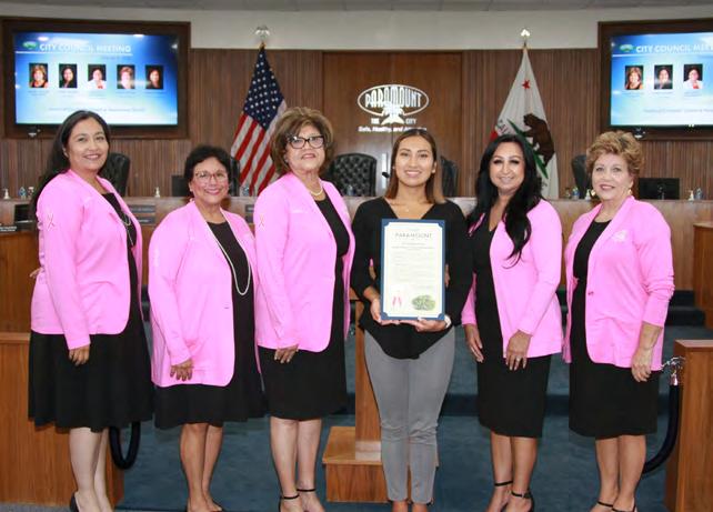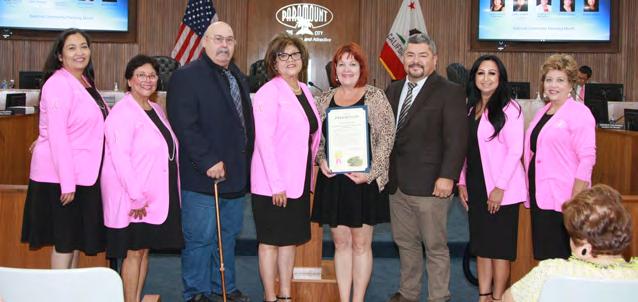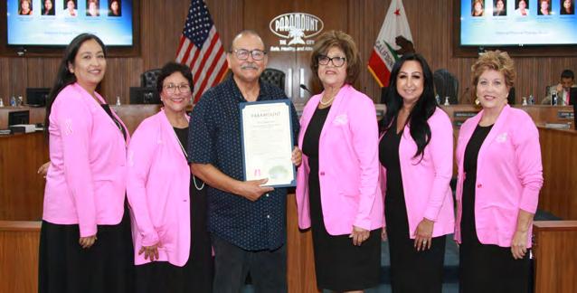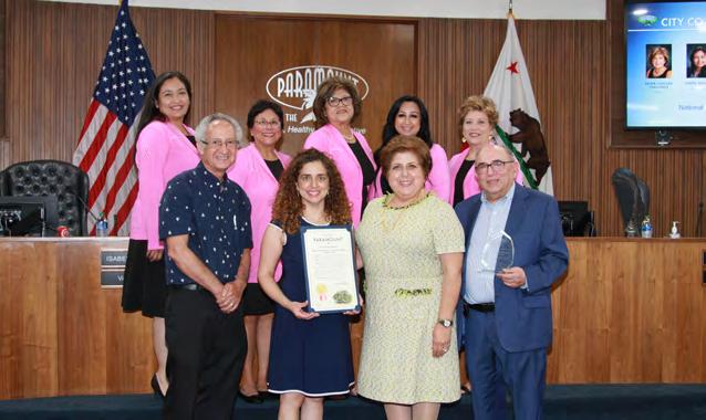 At the October 4 Paramount City Council meeting, Mayor Vilma Cuellar Stallings presented the latest Mayor’s Award of Excellence to Clínica Médica Hispana, which has been providing health care to the local community since 1979. To learn more, please see “From the Mayor’s Desk” in this issue. Back row, from left: Vice Mayor Isabel Aguayo, Councilmember Annette C. Delgadillo, Mayor Cuellar Stallings, Councilmember Brenda Olmos, and Councilmember Peggy Lemons. Front row: Manuel Alberty, Dr. Maribel Khoury, Mrs. Khoury, and Dr. Nabil Khoury.