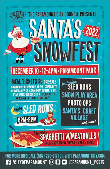 The event is free. A spaghetti and meatball lunch will cost $6 per person, pre-sale only. Meal tickets will be sold until December 1 at the Community Services office, 15300 Downey Ave., from 8 a.m. to 5 p.m.; the Paramount Park Community Center, 14400 Paramount Blvd., Monday through Thursday, 5 p.m. to 9 p.m.; and all STAR Afterschool sites between 2:30 p.m. and 6 p.m.